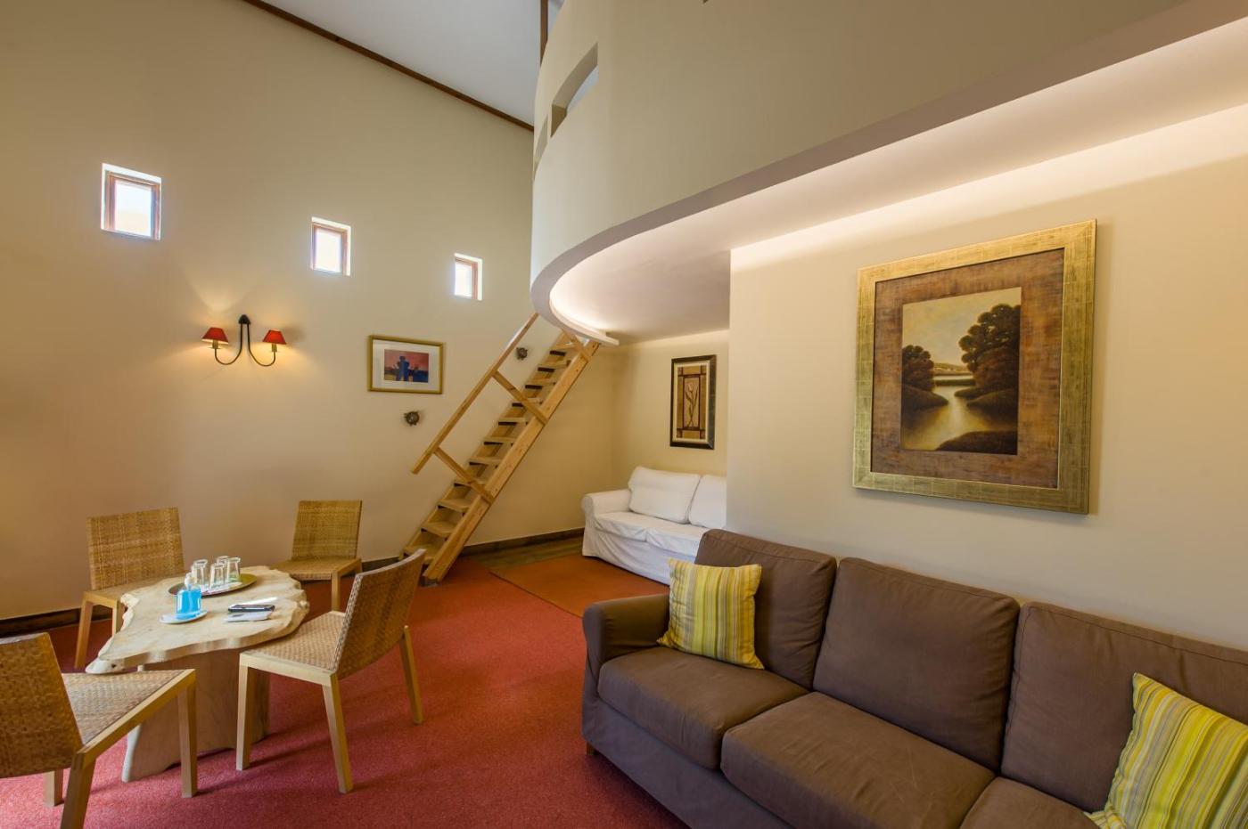King Studio with Sofa Bed. This type of spacious ground floor studios has an independent entrance with direct garden access and is not connected to the hotel lobby. There is central heating, additional independent air conditioning, and a realistic large and safe virtual fireplace. There is a staircase leading to a loft with a king size bed and at the ground floor there is the bathroom and a living area2 more people can be accommodated on a sofa bed. This type of accommodation is not recommended for elderly guests or very young children because of the staircase.