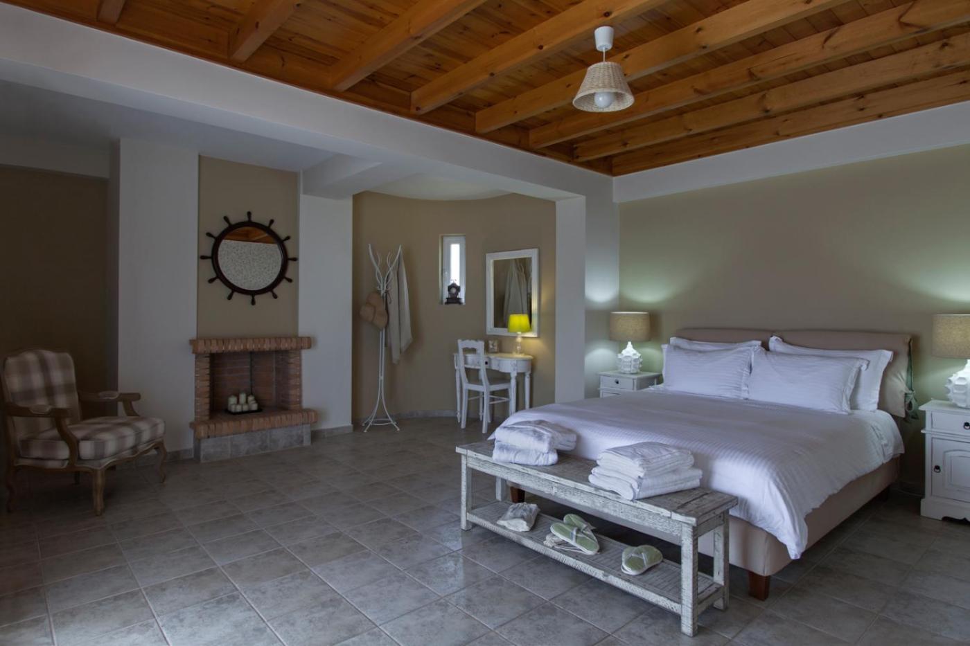 Three-Bedroom Villa (2-5 Adults) - Split Level. This modernly decorated villa features a paved terrace with views over the Ionian Sea. On the ground floor, there is a fully equipped kitchen, a living room with fireplace, indoor and outdoor dining areas and a bathroom. On the first floor there is a bedroom with fireplace, walk-in closet and a bathroom. Two more bedrooms can be found in the attic with a WC.